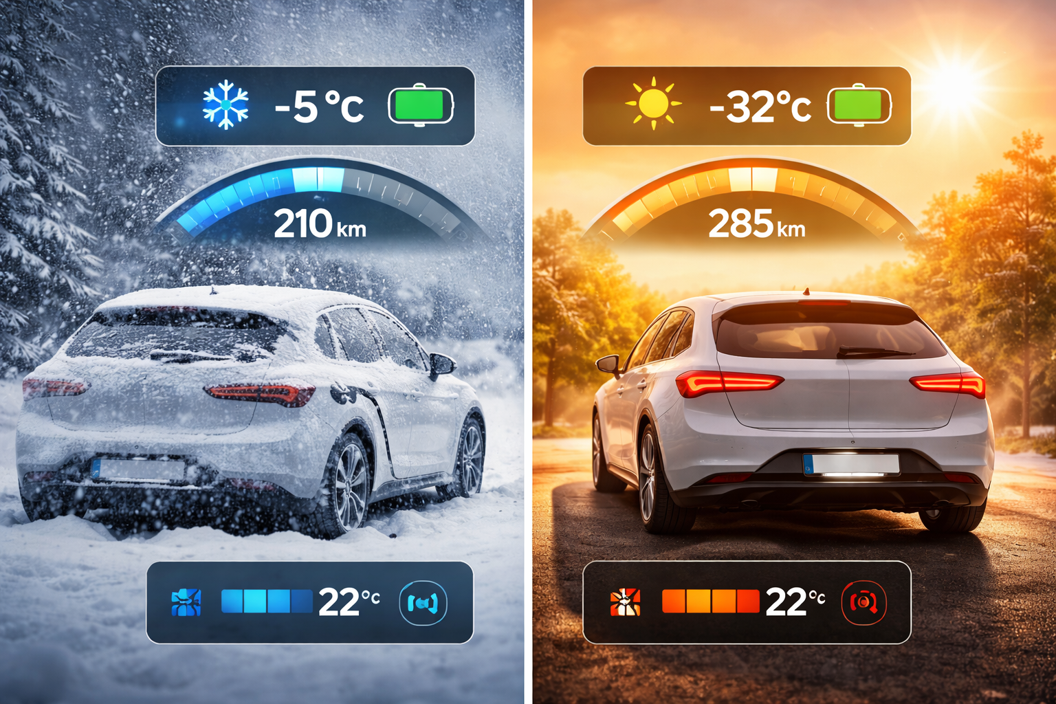 Clima afectează autonomia, e clar. Iarna e mai dureros decât vara, dar nu e un capăt de țară. Cu o pompă de căldură și puțină strategie (pre-încălzire în priză), diferența devine neglijabilă față de confortul pe care îl ai.
